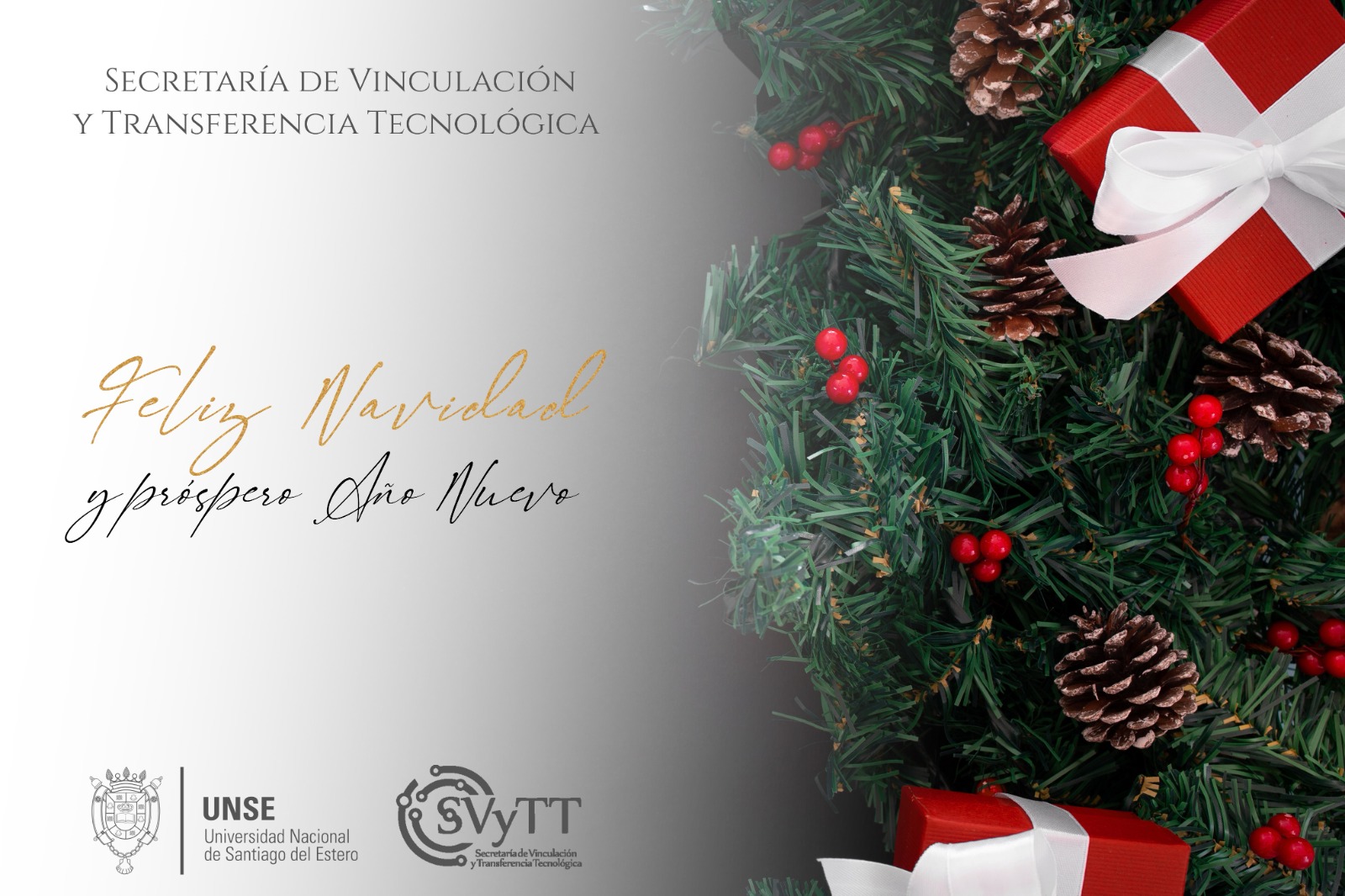 El equipo de la Secretaria de Vinculación y Transferencia de la UNSE, les desea que el espíritu de estas fiestas iluminen sus hogares y que este 2026 nos encuentre con renovadas energías para encarar cada uno de los proyectos personales y profesionales. ¡Felices fiestas!