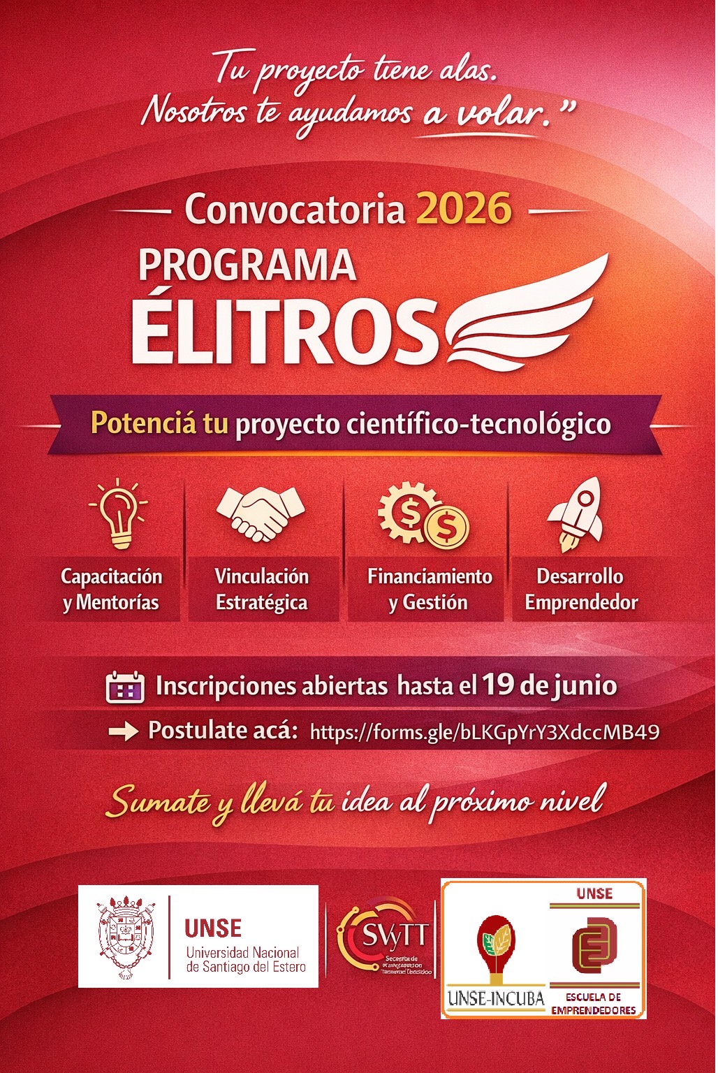 Se encuentra abierta la convocatoria 2026 del Programa Élitros, una iniciativa orientada a fortalecer emprendimientos científico-tecnológicos en etapa temprana. La inscripción estará disponible desde el 16 de marzo hasta el 19 de junio de 2026.